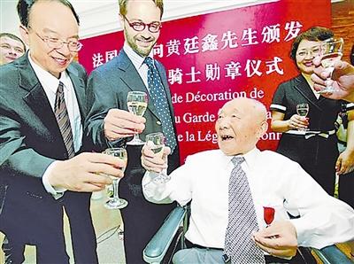 上图:2006年7月5日,黄廷鑫(右)与前来颁发勋章的法国驻上海总领事薛翰共同举杯庆祝。