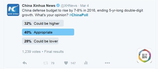 2016年,中国国防预算增长幅度7.6%,为近五年来首次降为个位数。这个幅度得到了大多数海外网友的认可。参与调查的40%的网友认为,中国国防费7%-8%的增速是合理的,还有32%的网友认为可以更高。