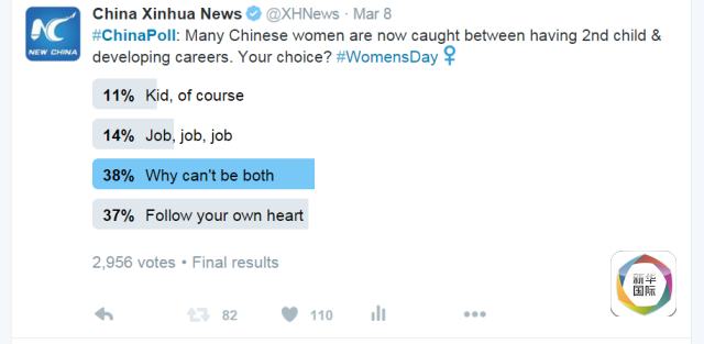 今年1月1日起,中国“全面二孩”政策落地,但一些家庭对于生育二孩存在顾虑,特别是许多女性担心会影响工作和就业。在被问及如何在生二孩与工作之间做选择时,参加调查的2956名海外网友中有38%的网友认为,孩子和事业都要有;另有37%的人认为,女性要顺从自己的内心;只有11%的人选择会因为孩子而放弃工作。