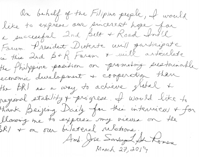 我代表菲律宾人民祝愿第二届“一带一路”国际合作高峰论坛取得成功。菲律宾总统杜特尔特将出席论坛。希望在“一带一路”框架下,两国加强经济合作。感谢北京日报对我进行采访,让我就“一带一路”倡议和双边关系发表观点。