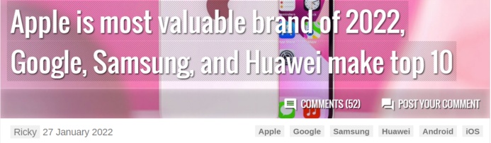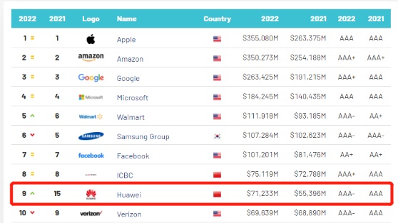 根据Brand Finance发布的排行榜,华为2021年的品牌估值为553.96亿美元,位居第15名,2022年的品牌估值为712.33亿美元,位居第9名。↓