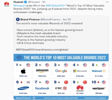 【环球网报道】1月26日,英国品牌估值与咨询机构Brand Finance发布了《2022年全球品牌价值500强报告》。华为官方推特账号@Huawei28日转发了该机构评出的“2022年全球品牌价值10强”图片并配文称,尽管面临许多不可预见的挑战,华为本次居排行榜第九名,与2021年相比上升了6名。↓
