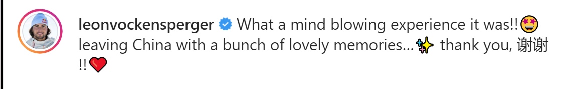 2月18日,沃肯施佩格乘机离开北京,他在“照片墙”上一口气分享了10张照片,并用英文写道,“多么令人兴奋的经历啊!我带着许多美好的回忆离开中国,非常感谢!”文末,他还特意用中文写了“谢谢”两个字,并配上爱心。