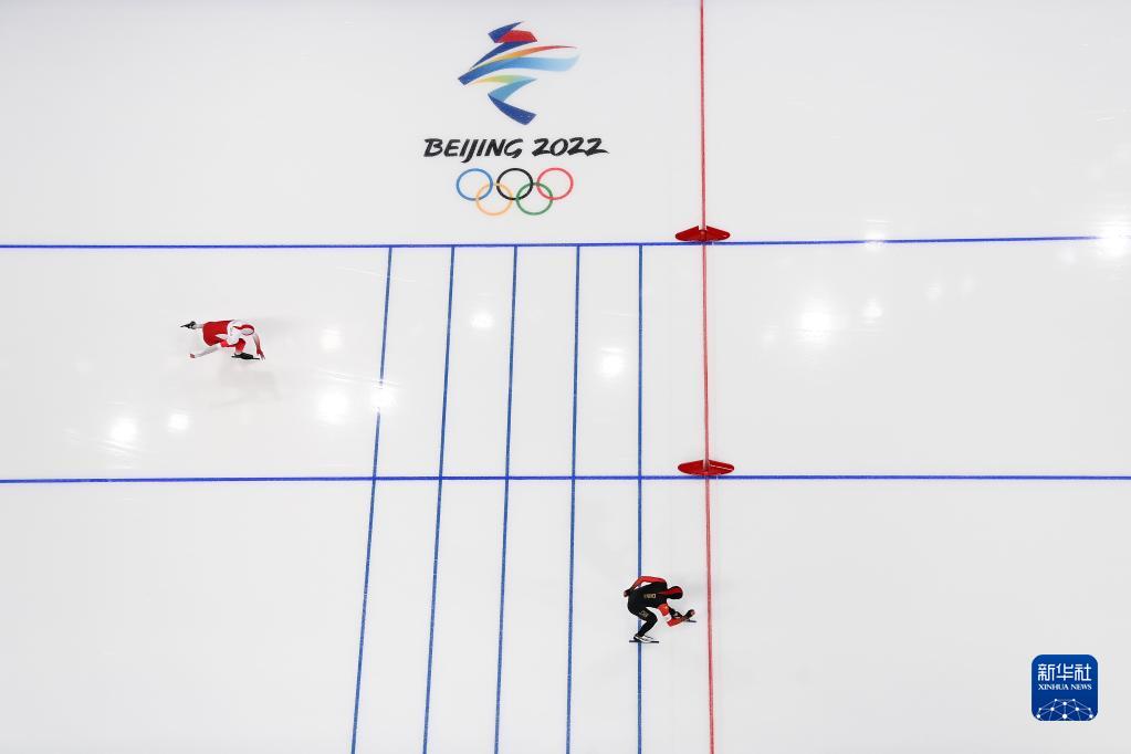 2月12日,北京冬奥会速度滑冰男子500米决赛在国家速滑馆“冰丝带”举行。中国选手高亭宇(下)在比赛中冲刺。图片来源:新华社 记者徐子鉴 摄