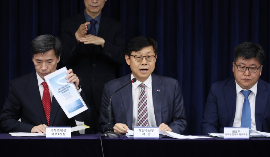 6月19日,韩国海洋水产部次官宋相根(中)在记者会上发言 图自韩国TBS广播电台报道配图