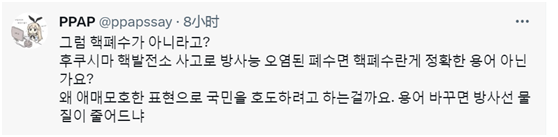 “所以这不是核废水?如果是福岛核电站事故中被放射性物质污染的废水,那么核废水不是正确用语吗?为什么要用模棱两可的措辞混淆国民视听?改变了措辞,放射性物质数量就减少了? ”