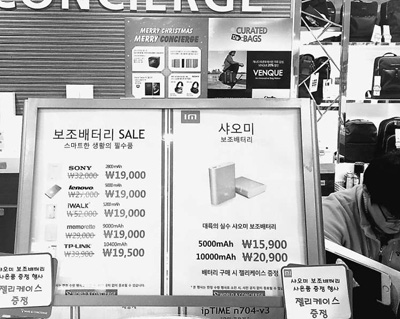 韩国首尔一家书店内的电子产品柜台前,小米移动电源的广告被摆在明显位置。记者 陈尚文摄