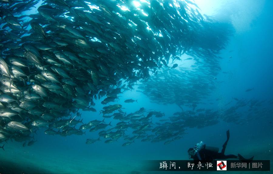 近日,摄影师Luis Javier Sandoval在墨西哥普尔莫角国家公园的水下捕捉到了这震撼的一幕,一名潜水员在海平面以下60英尺的地方邂逅了一个庞大的鱼群,有鲷鱼、黑色鼻子的蝴蝶鱼、黄貂鱼、豹石斑鱼等。 图片来源:新华网
