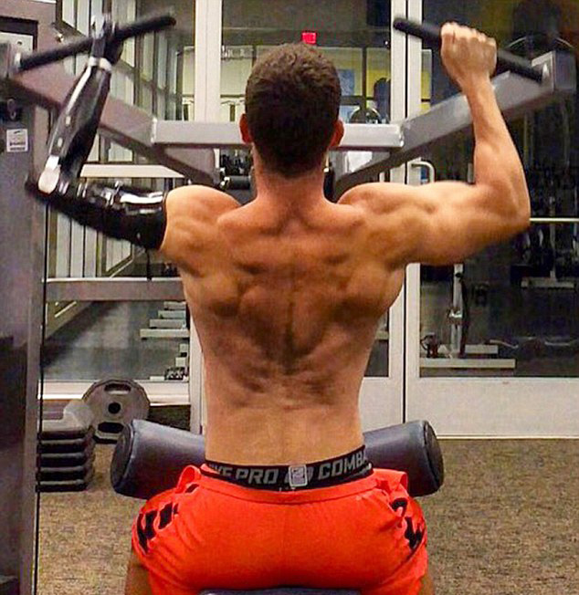 来源标题:美独臂男子身残志坚 戴义肢练出健美身材