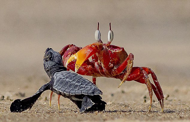 据英国《每日邮报》4月20日报道,近日,一组印度沙蟹欺负小海龟的图片蹿红网络。这只沙蟹被网友戏称为现实版的“蟹老板”。