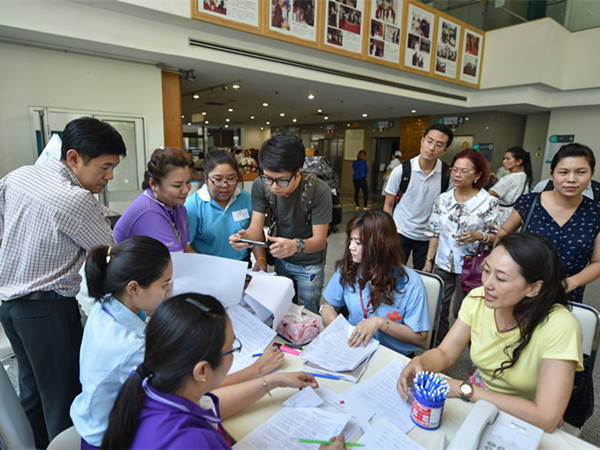 图为在泰国曼谷朱拉隆功国王纪念医院,受伤游客的亲友在问讯台咨询伤者情况和所在病房。(新华社李茫茫摄)