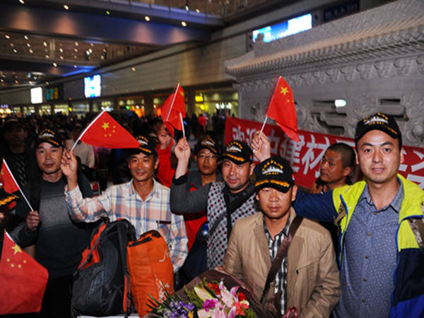 图为2015年3月31日,首批撤离也门的同胞抵达北京首都国际机场后挥舞国旗。(新华社马儒壮摄)