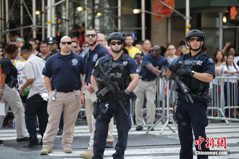 当地时间6月26日,纽约警察在游行队伍旁持枪警卫。当日,美国纽约举行规模盛大的同性恋骄傲大游行。男同性恋、女同性恋、双性恋、变性人,以及他们的支持者纷纷走上街头。中新社记者 廖攀 摄
