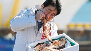 日本中央政府在消除对福岛农产品的负面印象上,也做足了功夫。首相安倍晋三亲自上阵,在选举活动现场品尝当地特色烤鱼,显示对当地农产品的支持,“看看看,首相的都吃得那么香,你们还有什么怕的呢?”