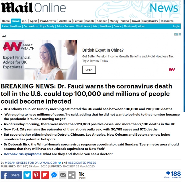 福奇在采访中也表示,预测是基于数据模型,有最好结果也有最差结果,而现实往往在二者中间。