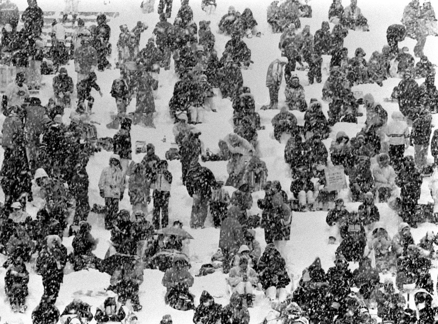 1998年长野冬奥会高山滑雪场上冒雪等待开赛的观众。新华社记者陈建力摄