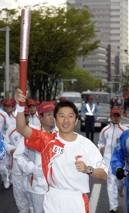 2008年4月26日北京奥运圣火在长野传递,火炬手荻原健司在进行传递。新华社记者戚恒摄