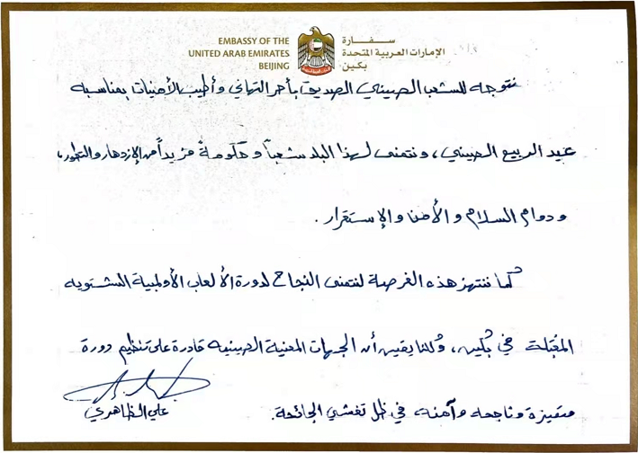 阿里·扎希里的驻华大使任期已经来到第五年,在接受北京日报客户端记者书面专访时,这位中国媒体的老朋友向北京冬奥会的成功举办送上诚挚的祝福。他表示,冬奥会这项重要的全球性活动,将是一个向世界展示中国积极、繁荣和开放国家形象的绝佳机会。阿联酋也希望通过举办世博会向国际社会再次敞开大门,并为寻求与阿联酋合作的中国和全球企业带来更多机会。