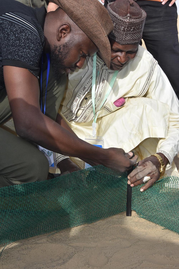 这位卡诺州环境部生态和林业主管按照中国专家的讲授和示范,把条状的可降解乳酸纤维沙袋灌满沙子,摆成方格形状,又拿起沉甸甸的铁锤,把小桩子敲进沙地里,围上高密度固沙网。