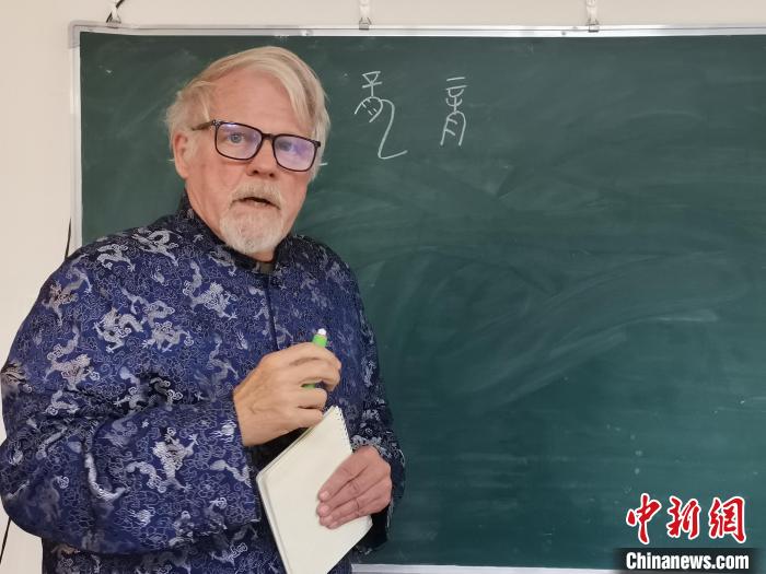 近日,理查德·西尔斯向记者讲述“龍”字的来源。中新社记者 葛勇 摄