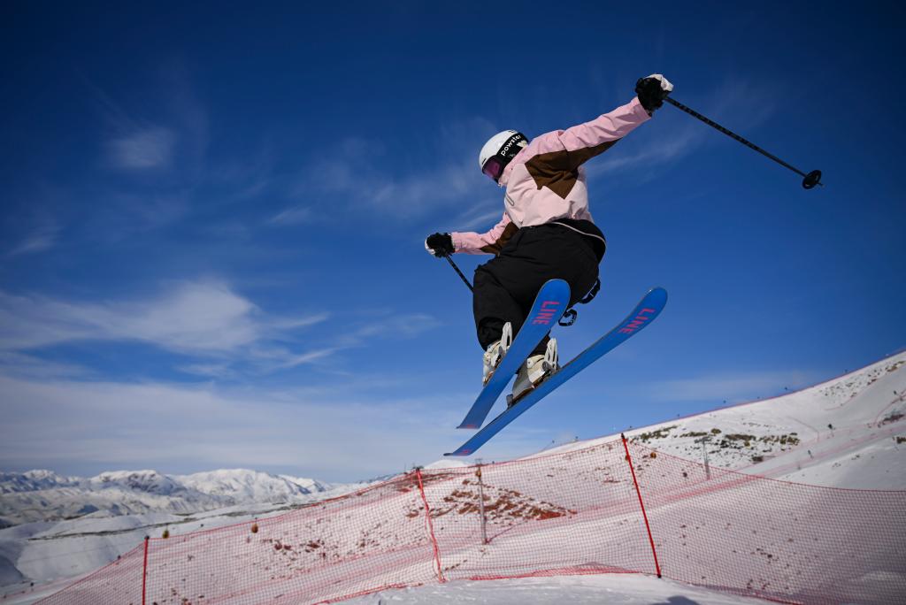 农历除夕当天,雪友在新疆阿勒泰将军山滑雪公园飞越跳台(1月28日摄)。新华社记者胡虎虎摄