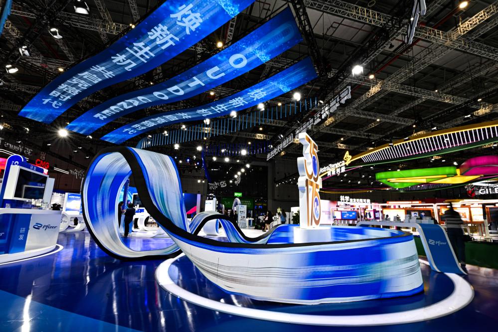这是2024年11月8日在第七届进博会医疗器械及医药保健展区拍摄的辉瑞展台。新华社记者辛悦卫摄