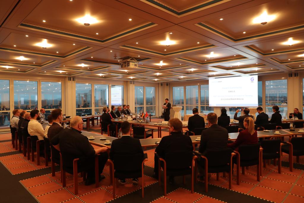 中国江苏省太仓市2024年1月22日在德国北威州贝库姆市为落户的第500家德企伯曼集团举行授牌仪式。新华社记者 杜哲宇摄