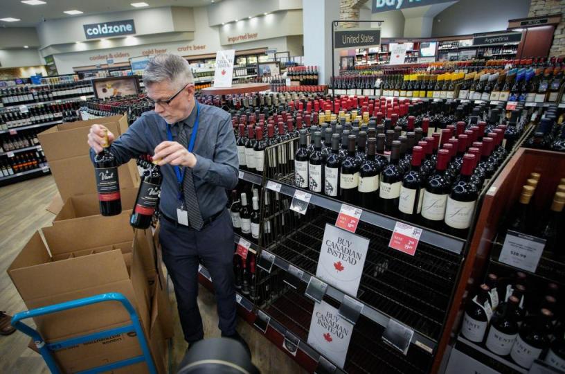 3月10日,在加拿大温哥华,一家不列颠哥伦比亚省酒类专卖店的店员从货架上撤下美国酒类产品。新华社 发(梁森 摄)