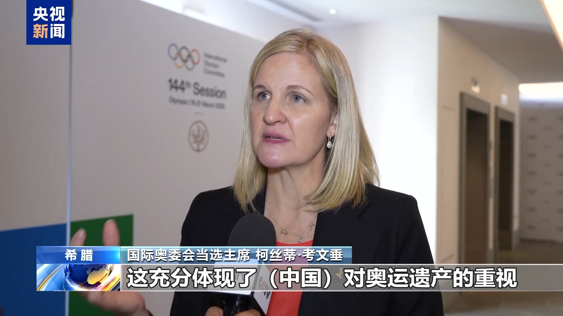 当地时间3月20日,在希腊举行的国际奥委会第144次全会上,来自津巴布韦的柯丝蒂·考文垂当选为国际奥委会主席。3月21日,柯丝蒂·考文垂接受了总台记者的采访。