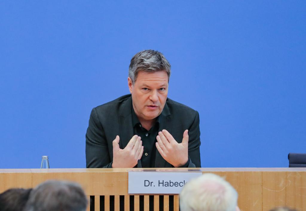 2月24日,在德国柏林,德国副总理兼经济部长哈贝克出席新闻发布会。新华社记者 张帆摄