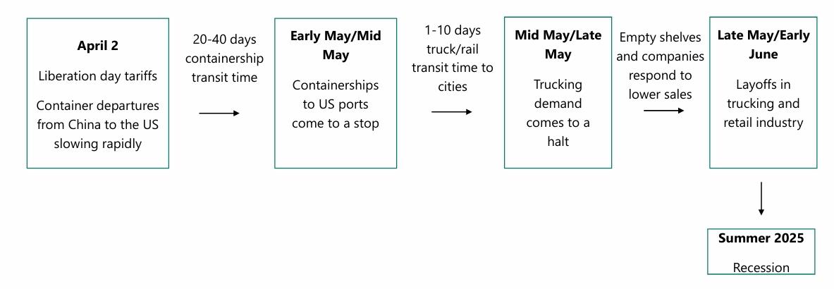 5月上旬至中旬,美国港口集装箱船进港逐渐停止。 5月中下旬,卡车货运需求逐渐停止,商店出现空货架,企业销售额下降。 5月底至6月初,卡车货运和零售业裁员。 2025年夏季,经济衰退。