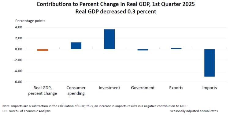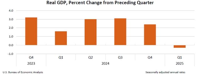 4月30日,美国商务部公布了2025年美国一季度经济数据,美国一季度国内生产总值环比(按年率计算)萎缩0.3%,为三年来首次负增长。