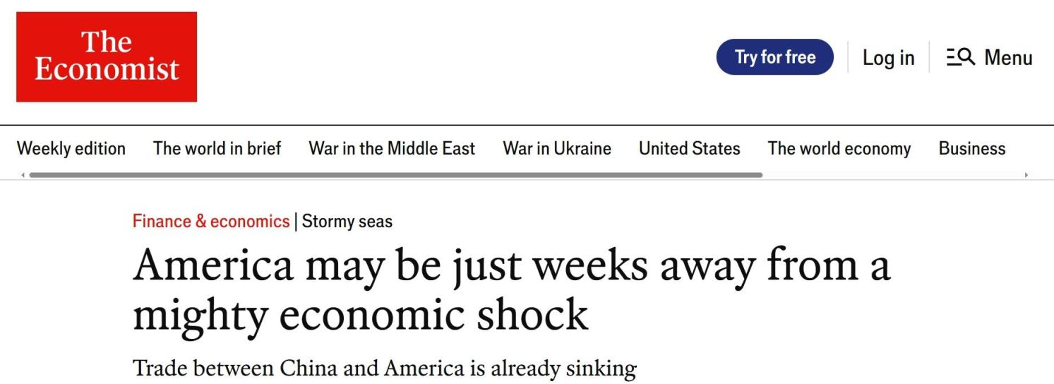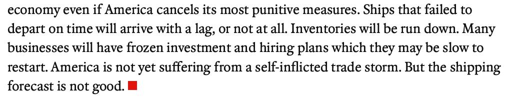 未能按时起航的船只将会延迟抵达,或者根本无法抵达。库存将会耗尽。许多企业可能已经冻结了投资和招聘计划,而且恢复这些计划可能会很缓慢。美国尚未遭受自己一手造成的贸易风暴的冲击。但航运前景不容乐观。
