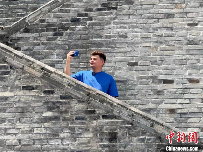 2025年5月14日,阿提拉站在宁海西门城楼上拍照。刘子琳摄