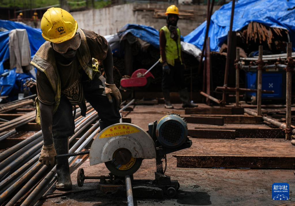 4月25日,在坦桑尼亚阿鲁沙综合体育场项目上,工人用切割机切割钢筋。新华社记者 李亚辉 摄