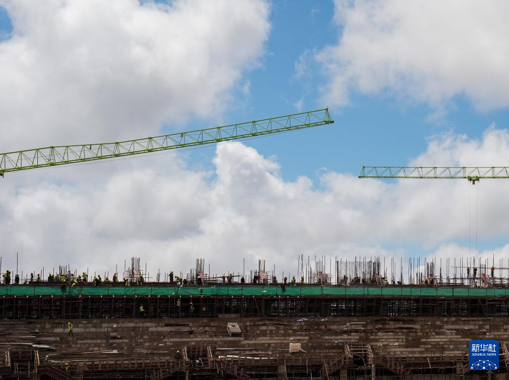 这是坦桑尼亚北部城市阿鲁沙的一片繁忙工地:六座高耸的塔吊伸展着钢铁巨臂,在高空精准吊运建材;焊接声、机械轰鸣声与指令声此起彼伏,交织成一首建设交响曲;上千名工人头戴安全帽、身着反光背心,正全力拉满施工“进度条”……一座现代化体育场已初具雏形。