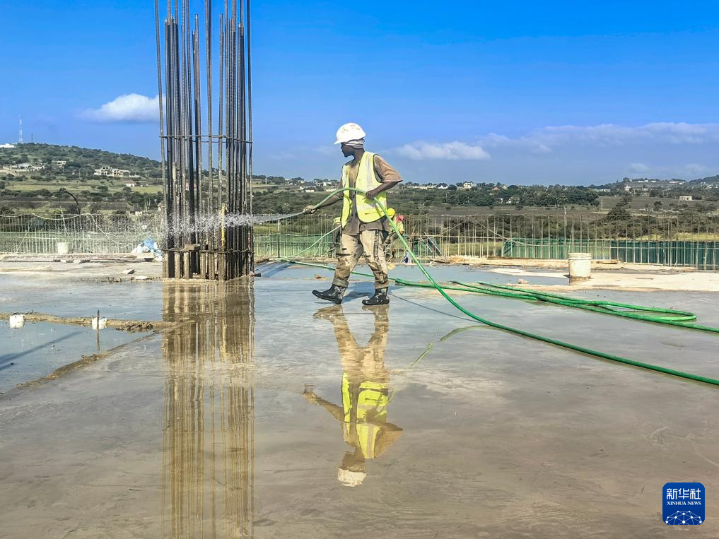 2月10日,在坦桑尼亚阿鲁沙综合体育场项目上,工人进行混凝土养护作业。新华社发(中国中铁建工集团有限公司供图)
