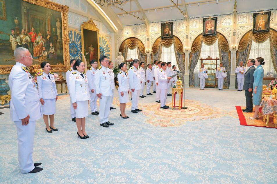 7月3日,在泰国曼谷律实宫,代理行使总理职权的泰国副总理兼交通部长素里亚·庄龙琅集率领改组后的新内阁成员向泰国国王玛哈·哇集拉隆功宣誓就职。新华社发(泰国王室宫务处供图)