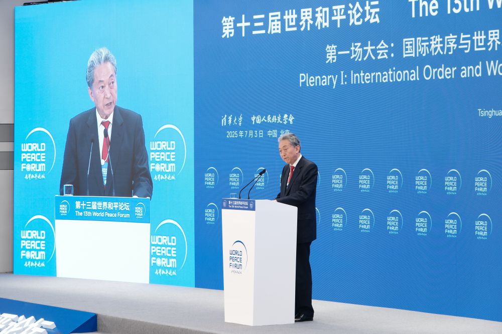 7月3日,日本前首相鸠山由纪夫在北京清华大学参加第十三届世界和平论坛。新华社记者邓仙来摄