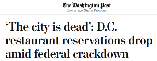 用当地餐馆老板的话说,“看到执法人员在社区里巡视我们的建筑、往窗户里看,无疑让顾客和员工都很紧张。”特朗普宣布由联邦政府接管首都治安的当天,华盛顿餐厅的在线预订量较去年同期下降16%。此后,预订量几乎每天都在下滑,单日同比降幅最高达31%。