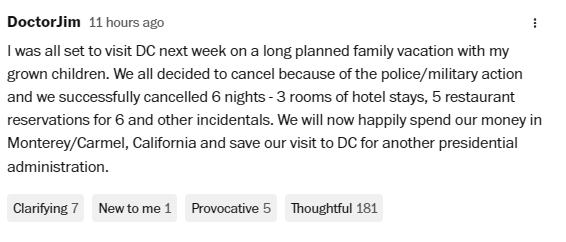 一位网友写道,他因为军警管制而取消了去首都的旅程,原本他和家人打算在华盛顿特区住6晚,在旅馆定了3间房,在餐厅提前定了5顿6人餐,但这些消费都被取消了。