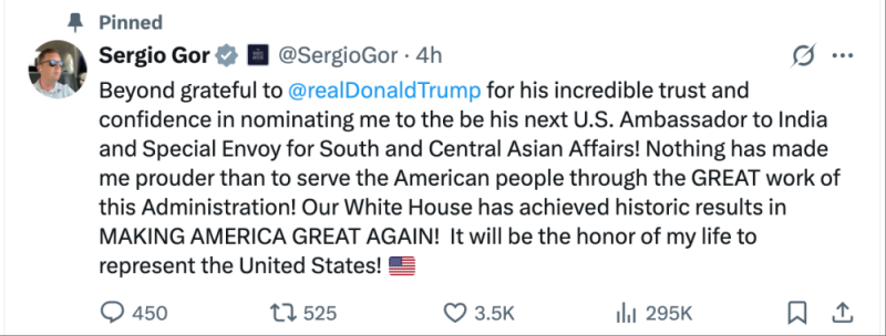 △戈尔感谢特朗普提名他为驻印度大使并将该帖文置顶。