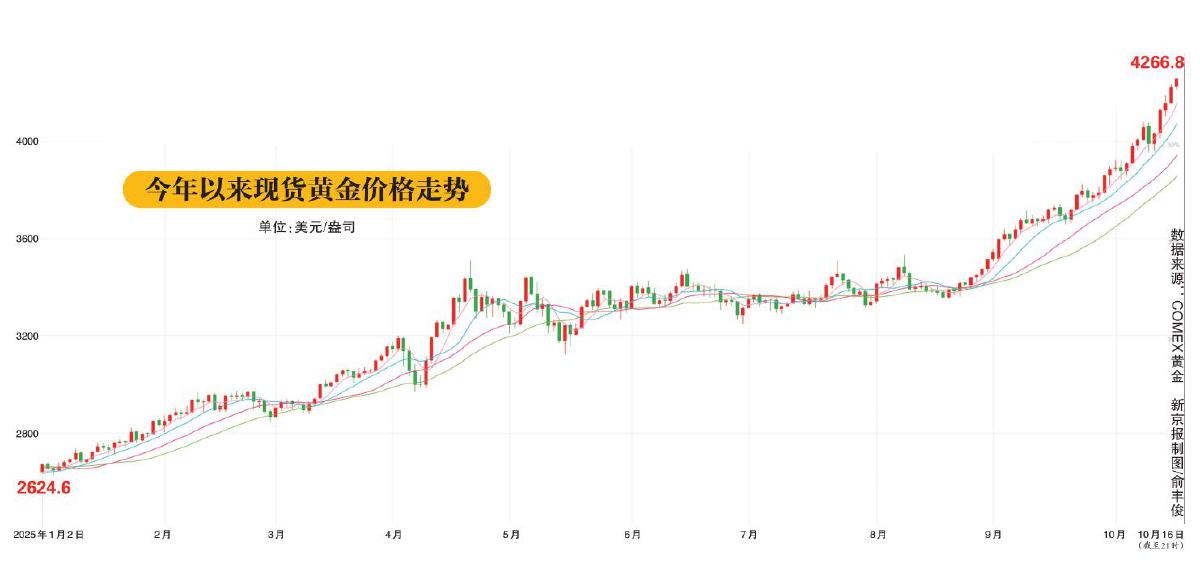 10月以来的黄金“狂欢”仍在继续。继月初现货黄金首次突破4000美元/盎司大关,10月15日,COMEX黄金盘中突破4200美元/盎司,年内涨幅超52%。金价震荡上涨,多家银行相继上调积存金起购金额。