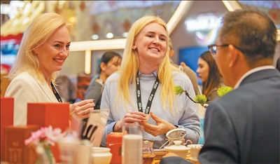 在中国展区,两名英国参展商一边品茶,一边与中国旅游企业代表交流。本报记者 许立群摄