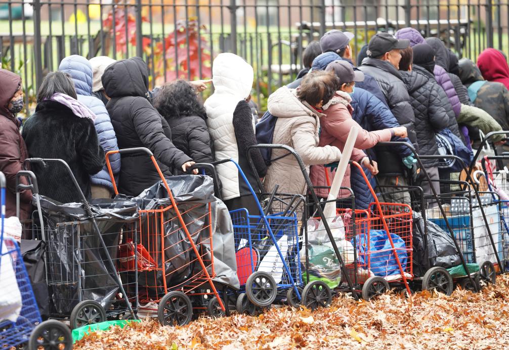 11月12日,人们在美国纽约一处食物发放点等待领取食物。新华社记者张凤国摄