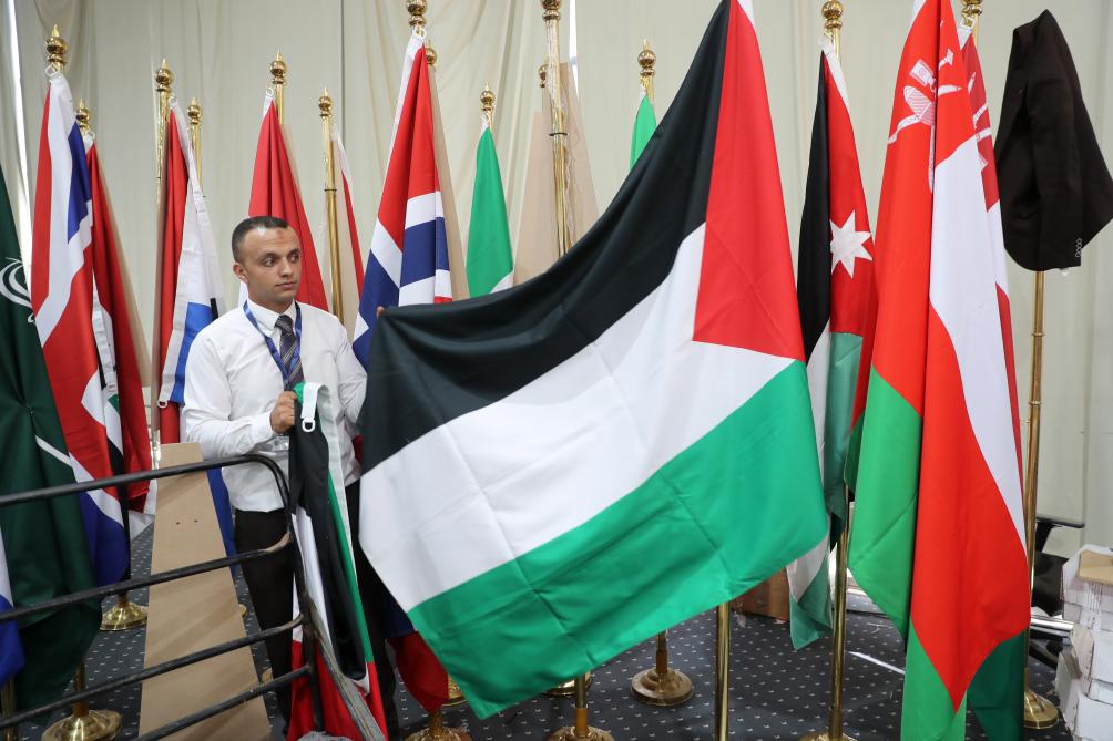 10月13日,在埃及沙姆沙伊赫,一名工作人员在沙姆沙伊赫峰会的媒体中心整理巴勒斯坦国旗。新华社记者隋先凯摄