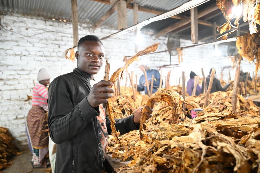 7月10日,在津巴布韦东马绍纳兰省一座农场内,当地工人展示刚刚收获的烟叶。新华社记者许正摄