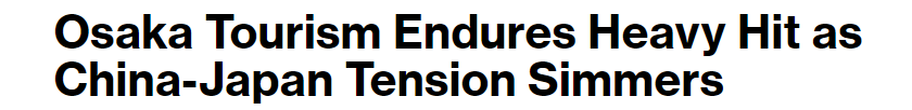 文章说,大阪是日本第二大经济中心,其经济活力与旅游业紧密相连,尤其在过去几年里,中国游客是推动当地旅游消费的重要力量。但如今这个城市正承受着中国游客减少带来的巨大冲击:大阪关西国际机场的航班削减幅度在日本全国最为显著,当地酒店、零售商和餐馆也面临着大面积的订单取消。