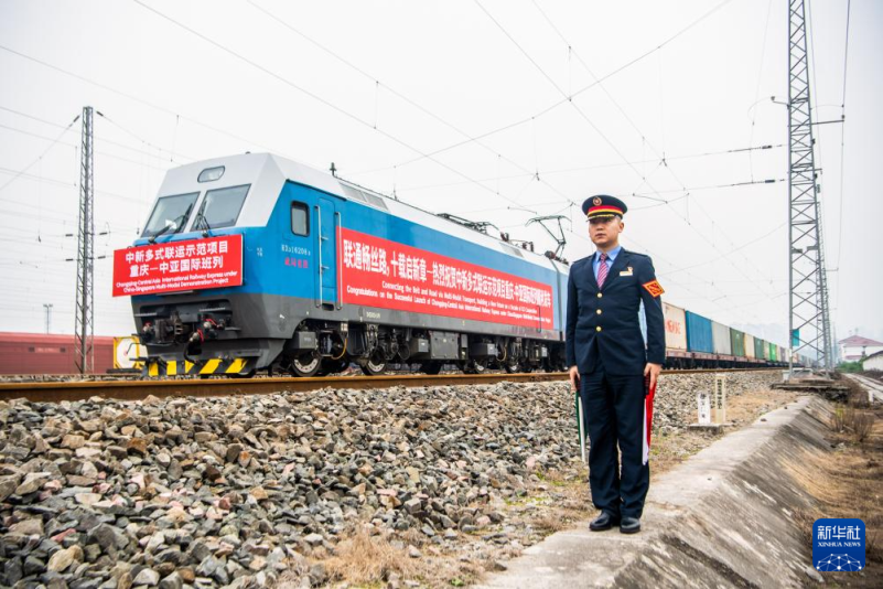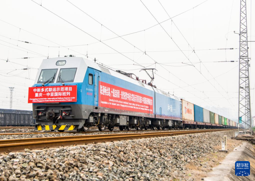 15日,一列装载化工产品、摩托车零配件等货物的中新多式联运示范项目重庆—东南亚班列缓缓驶出重庆鱼嘴铁路货运站,将向南经广西钦州以铁海联运方式发往东南亚新加坡。与此同时,另一条轨道上,一列装载汽车KD件的中新多式联运示范项目重庆—中亚国际班列同步发车,将向西经阿拉山口以国际铁路联运方式发往中亚哈萨克斯坦。