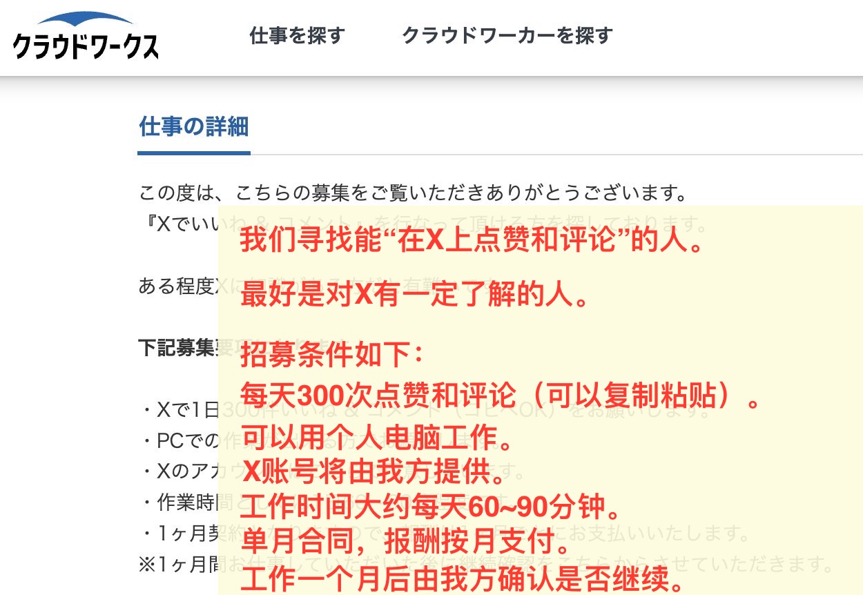 在CrowdWorks平台上,除了内容制作的招募信息,还有人发帖招人点赞、评论、转发。比如,日本网民分享的一条招募信息截图显示,发包者要求接单者每天在社交媒体上点赞和评论300次,评论可以简单“复制粘贴”。